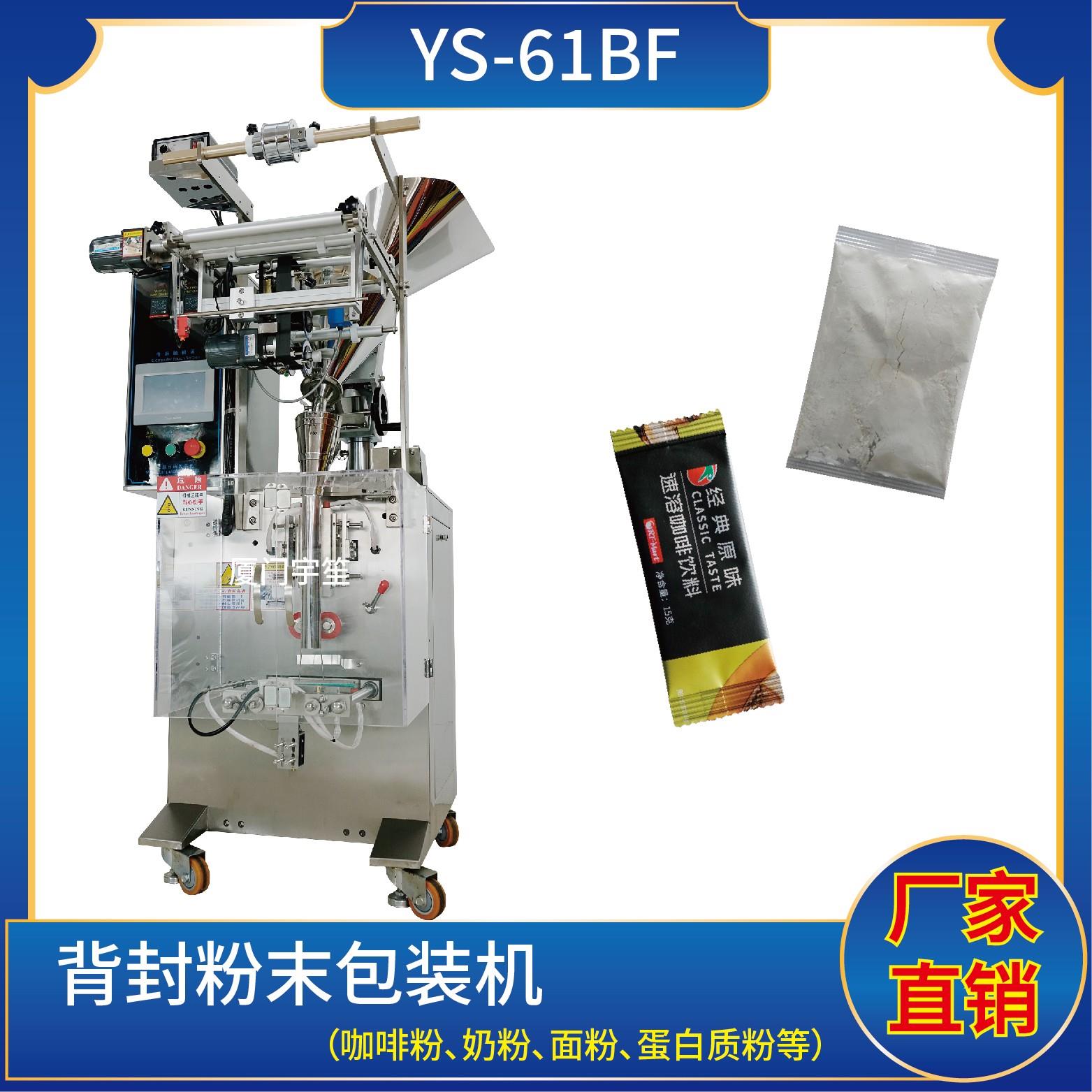 YP-61BF 背封粉末包裝機特點1、適用于食品、醫藥、化工、化妝品行業中顆粒物品的計量包裝。2、可自動完成制袋、計量、下料、封合、分切、計數、且可根據客戶要求配置打印批號等功能。3、觸摸屏操作,PLC 控制,驅動步進電機控制袋長,性能穩定、調整方便、檢測準確。智能式溫控儀,PID調節,保證將溫度的誤差范圍控制在1℃…