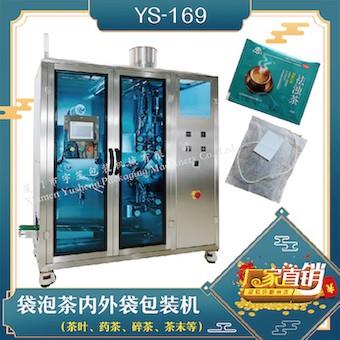 YS-169 袋泡茶內外袋包裝機(新框式)特 點1、適用于茶葉、藥茶、保健茶草根類等小顆粒物的內外袋一次性包裝。2、內、外袋拉膜由步進電機控制,袋長穩定、定位準確。3、采用PID調節溫度控制器,溫度控制得更準確。4、采用PLC控制整機的動作,人機界面顯示,保證產品的衛生可靠。5、包裝材料:茶葉濾紙、棉線、復合膜及標簽?!?/p>