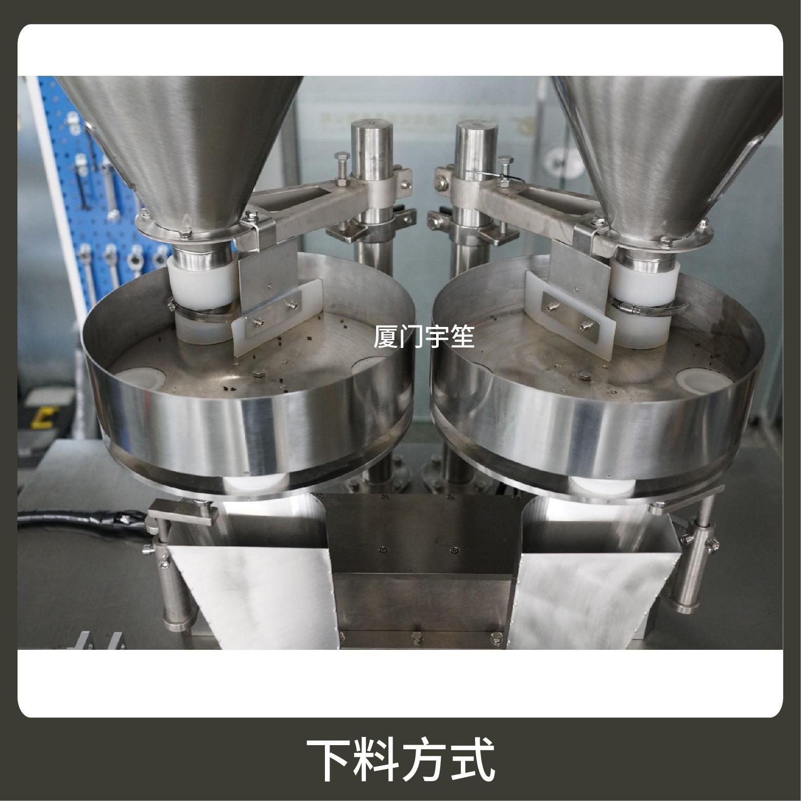 2、成品雙出,速度快,包裝流程全自動,無需人工操作。可根據(jù)充填物料的性質(zhì)選配不同的下料結(jié)構(gòu)。