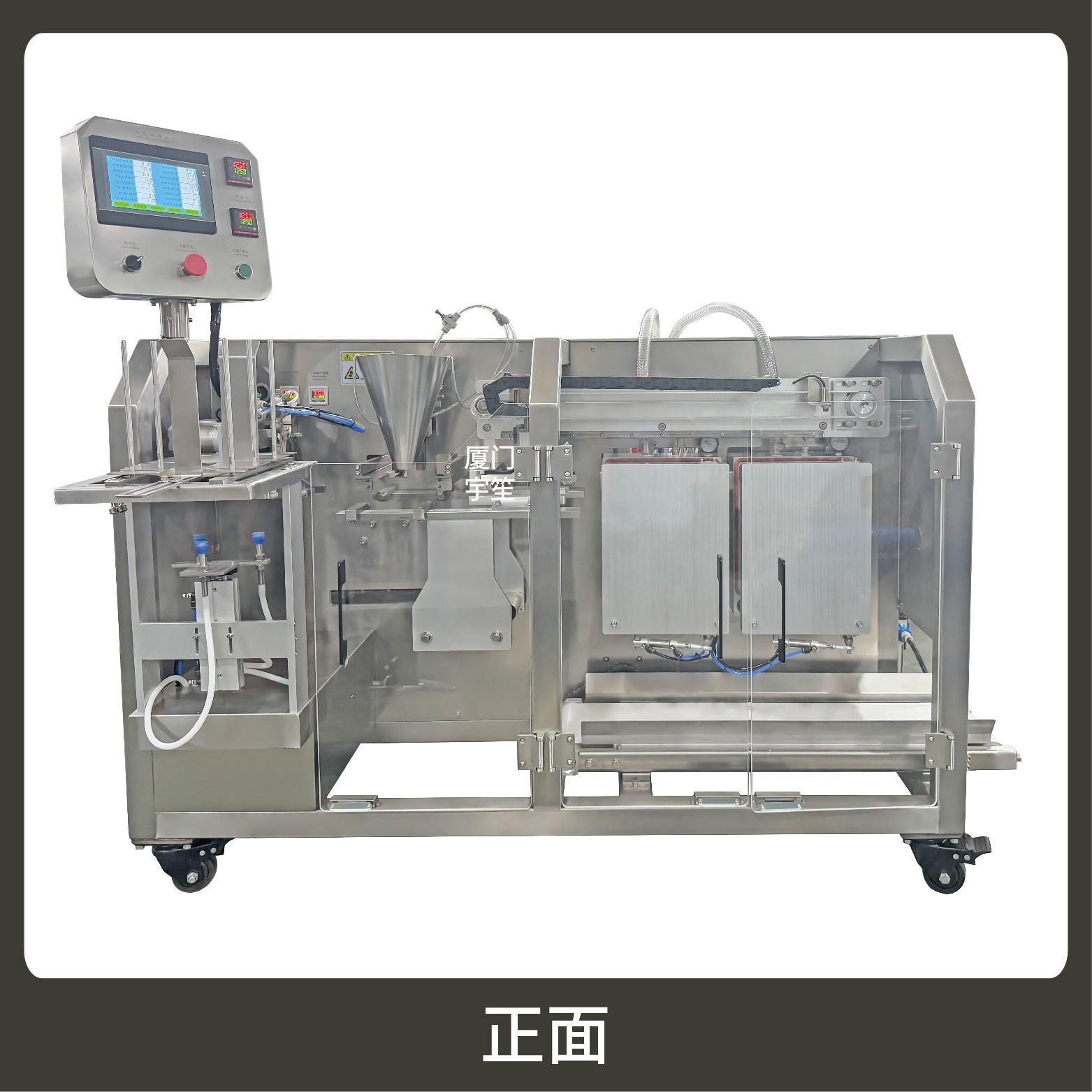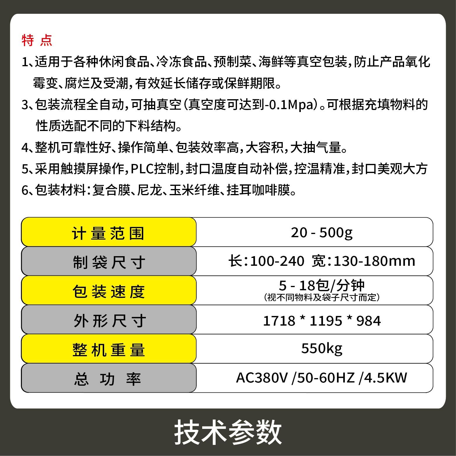 2、包裝流程全自動,可抽真空(真空度可達到-0.1Mpa)。可根據充填物料的性質選配不同的下料結構。